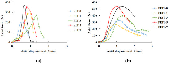 The splitting tensile force and displacement curves of EIT and FEIT after dry–wet cycles are shown in Figure 12.