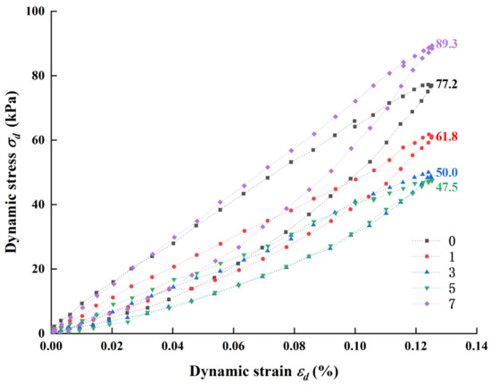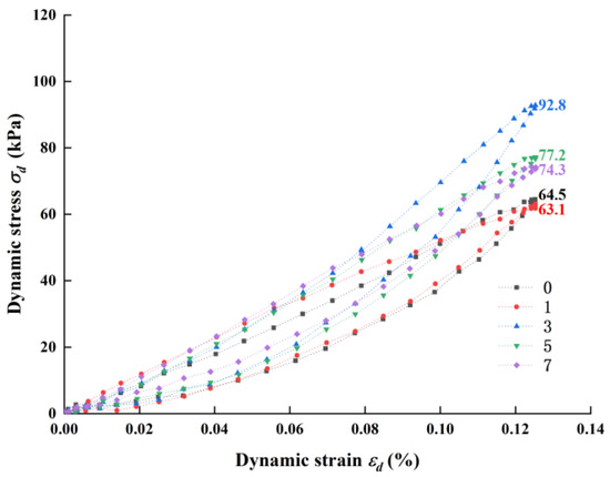 Under the condition of strain control, the peak strain will not change. The greater the height of the hysteretic curve, the greater the maximum dynamic stress and the smaller the dynamic strain required to reach the maximum dynamic stress. The inclination angle of the hysteretic curve can reflect the change in the dynamic elastic modulus of soil under cyclic load [35]. The larger the inclination angle of the hysteretic curve, the larger its dynamic elastic modulus.