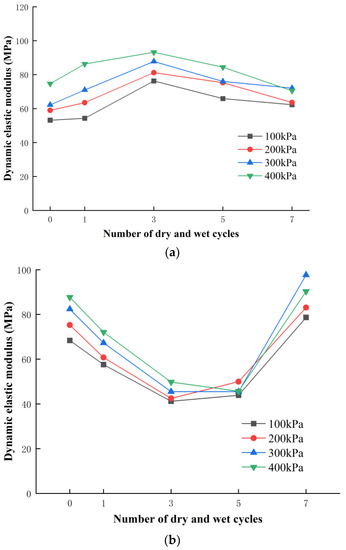 It can be seen from Figure 14 that when the confining pressure is 100 kPa, the maximum dynamic stress of EIT first increases and then decreases with the increase in dry and wet cycles. After the third dry and wet cycle, the maximum dynamic stress reaches 92.8 kPa. After seven dry and wet cycles, the dynamic stress of EIT increases by 15.2% compared with zero dry and wet cycles. After the cyclic load is applied, the inclination angle of the hysteretic curve of EIT under different dry and wet cycles increases, i.e., the dynamic elastic modulus increases.