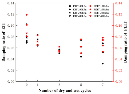 - The dynamic stress of EIT and FEIT increased after seven dry–wet cycles. The dry–wet cycle is the main factor affecting the change in the dynamic elastic modulus of EIT and FEIT. Under the same confining pressure, the dynamic elastic modulus of EIT first increases and then decreases with the increase in dry–wet cycle times. On the contrary, the dynamic elastic modulus of FEIT first decreases and then increases with the increase in dry–wet cycle times. After seven dry–wet cycles, FEIT has better resistance to dynamic load deformation than EIT. The damping ratio of EIT and FEIT decreases with the increase in dry–wet cycles, and then tends to be stable. The damping ratio of FEIT is greater than that of EIT, and the dry–wet cycles can promote the vibration resistance of FEIT.