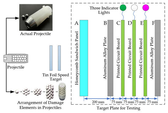 The projectile consisted of a nylon shell and internal metal elements and was launched by a pyrotechnic launcher. The projectile hit and penetrated the honeycomb sandwich panel on the surface of the satellite at a speed of 325 m/s, as indicated by ① in Figure 3. When the projectile hit the higher-strength aluminum alloy shell of the electronic device, the nylon shell shattered, and the internal damage elements spread out, as shown in ② of Figure 3. In addition, the projectile was axially compressed upon impact, which was further converted to radial expansion potential energy. The damage elements spread horizontally and axially, causing regional damage to various electronic components inside the device.