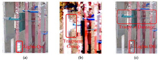 Test configuration. (a) Before the damage, the lights were on. (b) During the penetration, the damage elements and the plate formed fragments. (c) After the damage, the lights were off.