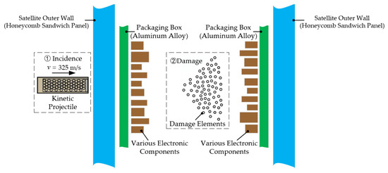 The damage mechanism of the kinetic projectile is shown in Figure 1. The kinetic projectile needed to meet the damage requirements, which meant that the kinetic projectile must penetrate the surface of the satellite (target A) and the aluminum shell (target B); then, the projectile spread the damaged elements and generated regional damage to the internal electronic components (targets C–E); however, the projectile and the damage elements could not penetrate the surface of the satellite on the other side (target F), meaning that the generation of space debris was avoided.