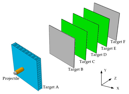 A simulation model of the projectile damaging the multi-layer plates was established in ABAQUS; the visualization of the model is shown in Figure 4. The case and bottom of the projectile were solid parts, with element type C3D8R. According to our observations, the damage elements did not experience visible deformation during the experiment, so, in the numerical model, they were modeled as rigid bodies, and their element type was set as R3D4. The layout of the target plates was the same as in the test conditions, and the area of each target plate was 150 mm × 150 mm. In order to capture the physics of damage elements penetrating the plate, it was necessary to refine the mesh in the central area of the target plate. The honeycomb sandwich panel was composed of two skins and a honeycomb core. The thicknesses of the skin and core were 0.5 mm and 19 mm, respectively, and the wall thickness of the honeycomb cell was 0.08 mm. Based on [19], the honeycomb core was modeled using shell elements with element type S4R due to the extremely low thickness. The honeycomb skins were modeled as solid elements with element type C3D8R. The thicknesses of targets B and F were 2 mm, and the thicknesses of targets C, D and E were all 1.6 mm. These target plates were solid elements of type C3D8R. The initial velocity of the projectile was set as 325 m/s, and the boundaries of the target plates were fixed. General contact was employed for interactions between different parts.