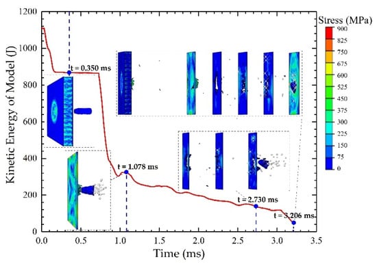 The curve of the total kinetic energy of the model over time is shown in Figure 5. The stress nephograms at four moments were selected to show the damage process of the projectile hitting the targets. When the projectile passed through the honeycomb sandwich plate (target A), it was compressed and deformed slightly, but the cartridge case was not broken. However, when the projectile hit target B, the cartridge case broke, and the internal damage elements were scattered both laterally and axially. At this time, the sudden dissipation of the total kinetic energy was observed. Afterwards, the damage elements hit the circuit boards regionally before falling to the bottom of projectile. All damage elements penetrated target C, while four and nine damage elements were unable to penetrate targets D and E, respectively. After penetrating the three circuit boards, the damage elements and the target fragments formed a large area fragment group. Then, the fragment group hit target F but did not penetrate. During the entire process, the fragment group remained between target A and target F, so target F was not penetrated.