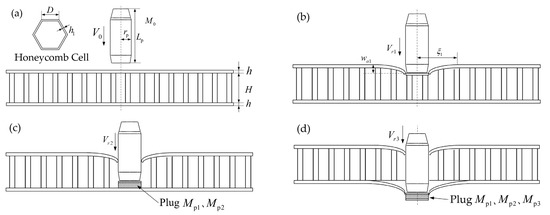 The schematic diagram of the projectile hitting the honeycomb sandwich panel is shown in Figure 7a. The honeycomb sandwich panel was composed of a front skin, a back skin and a honeycomb core, where is the thickness of the skins, is the thickness of the honeycomb core, is the wall thickness of the honeycomb cell and is the side length of the honeycomb cell. The projectile has a blunt tip, is the projectile radius, is the projectile diameter, is the projectile mass and is the initial velocity of the projectile. According to the study of Fatt [13], the penetration of the honeycomb sandwich panel could be decomposed into three stages: the perforation of the front skin, the honeycomb core and the back skin.