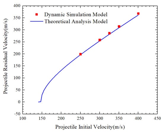 In order to see the consistency more clearly between the theoretical model and the simulation model, Figure 8 shows the relationship between the initial velocity and the residual velocity. It can be seen that the simulation datapoints basically coincide on the theoretical curve, indicating that the simulation results support the theoretical model.