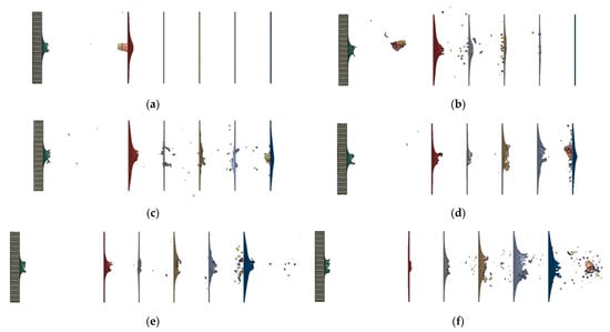Figure 10 shows the damage effects of the kinetic projectile impact under different initial velocities. When the initial velocity was 250 m/s, the projectile did not penetrate target B in the simulation. When the initial velocity was 300 m/s, the damage elements penetrated target B and spread inward, but the projectile bottom did not penetrate. When the initial velocity was in the range of 325–350 m/s, the projectile bottom penetrated target B. When the initial velocity was greater than or equal to 400 m/s, some fragments began to penetrate target F. The damage requirements for the simulation were that the entire projectile must penetrate the honeycomb sandwich panel, and the damage elements must penetrate target panel B and disperse to the inside, and none of the fragments can penetrate target F. Our results indicate that the initial velocity range that should be applied to meet these requirements is 325–350 m/s.