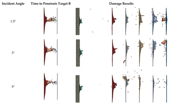 Figure 11 shows the damage effect of the kinetic projectile impact under different incident angles. Due to the launch conditions, there was generally an incident angle when the projectile impacted the target—that is, the angle between the projectile axis and the normal target direction. In order to investigate the influence of the incident angle on the damage characteristics, simulations were carried out under different incident angles. Two moments were selected to analyze the damage process, as shown in Figure 11. The first (images on the left) was the partial display when the damage elements were scattered, and the second (right side) was the whole picture when the damage process was complete.