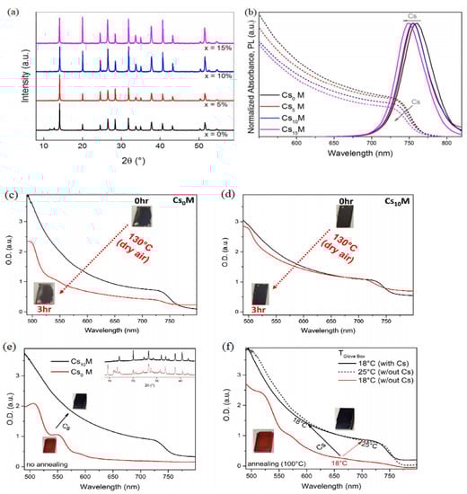 Different spectrum of perovskite with different amounts of Cs (a) XRD, (b) Absorbance and PL spectra; UV–vis absorption of (c) Cs0M and (d) Cs10M films which were annealed at 130 °C for 3 h in dry air; (e) absorption spectra of as-fabricated materials which were not annealed at room temperature. The perovskite characters of Cs10M can be shown in the inset XRD data; (f) absorption spectra showed perovskite phase of Cs0M formed at 25 °C (dashed black line) and perovskite phase of Cs10M formed at 18 °C (solid black line) by using the spin coating. Reprinted with permission from Ref. []. Copyright 2016 Royal Society of Chemistry.