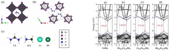 Structures of α-phase (a,b) δ-phase of pure FAPbI3; (c) The structures of four cations (FA+, MA+, Cs+, and Rb+); Band structure of α-FAPbI3 (d), α-MA0.25FA0.75PbI3 (e), α-Cs0.25FA0.75PbI3 (f) and α-Rb0.25FA0.75PbI3 (g). Reprinted with permission from Ref. []. Copyright 2019 AIP Publishing.