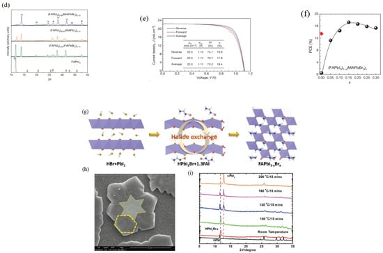 In 2018, Li et al. used Cs+ and Br− to improve stability of α-FAPbI3 []. Deep research found that Cs+ doping was not enough to stabilize black-phase and Br− anion can stabilize the α-phase of FAPbI3. Finally, Cs+ and Br− co-doped FAPbI3 have some advantages, such as higher performance optoelectronics, good stability and a long carrier lifetime of 1.23 µs (Figure 3a,c) []. Jeon et al. researched the stability of (FAPbI3)1−x(MAPbBr3)x when the value of x ranged between 0 and 0.3 []. MAPbBr3 can stabilize the α-FAPbI3 and improve PCE. According to XRD spectra, the pure FAPbI3 has a hexagonal non-perovskite (P63mc) after annealing at 100 °C. And then a strong (111) diffraction peak at 13.9°C of the trigonal perovskite phase (P3m1) appeared when MA+ cation and Br− ions (15 mol%) were added to FAPbI3 (Figure 3d). A complete bilayer on a mesoporous TiO2 was successfully fabricated by using solvent-engineering technology. (FAPbI3)1−x(MAPbBr3)x has many advantages compared to the pure FAPbI3 (Figure 3e). The PCE of (FAPbI3)1−x(MAPbBr3)x can be achieved to 18.4% (Figure 3f) []. Long and co-workers developed a halid-exchange process (HEP) reaction (Figure 3g,h) []. XRD exhibited the structure stability of HPbI2 (Figure 3i). The large-grained and compact FAPbI3−xBrx thin films can be deposition without using antisolvent. The stability of FAPbI3−xBrx can be enhanced by reduced bromide. Br-doping can inhibit the α-phase conversion into δ-phase and stabilize the final α-phase. The reaction was described as: