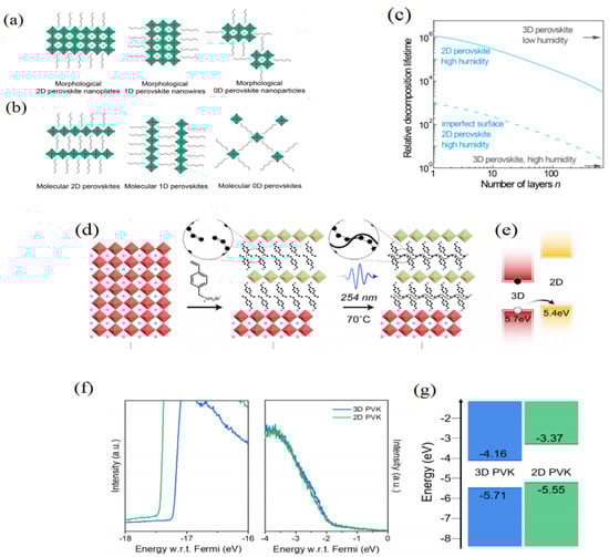 (a) The different morphological perovskites, and (b) different molecular perovskites. (Reprinted with permission from Ref. []. Copyright 2018 WILEY-VCH Verlag GmbH &Co. KGaA, Weinheim). (c) DFT simulation of the formation energy of 3D and 2D perovskite with different n values. (Reprinted with permission from Ref. []. Copyright 2016 Royal Society of Chemistry). 2D/3D heterostructures have formation and optical properties by using the ligand VBABr. (d) Schematic diagram of processing which cross-linked 2D perovskites were formed by using the VBABr; (e) Energy level of the 2D/3D interface. (Reprinted with permission from Ref. []. Copyright 2019 ACS Publication). (f) UP spectra of the 3D perovskite and the 2D perovskite. (g) Energy levels of the 3D and 2D perovskites. Reprinted with permission from Ref. []. Copyright 2021 Science.