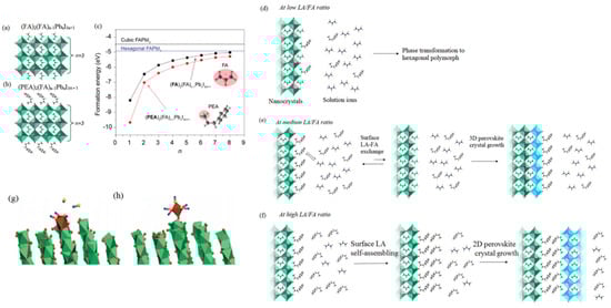 However, the surface energy can be reduced by the surface PEA termination. This confirmed that replacement of surface FA with PEA cation was thermodynamically favorable regardless of the n value (shown in Figure 6a,c). The schematic of the proposed growth processes under various LA/FA ratios (α) is shown in Figure 6d,f. Under low α values, the amount of LA cations was not enough to stabilize the perovskite lattice. When α value was higher, LA cations were sufficient and occupied all surface sites. Under proper α values, the surface ligand cations were equilibrium with the free cations in the solution and LA cations were used to modify the perovskite surface in order to stabilize it. Moreover, this FAPbI3 perovskite stabilized at RT over several months has excellent photophysical properties. So the surface chemistry on the thermodynamical of perovskite materials is very important. Recently, Lu et al. investigated the conversion from δ- to α-FAPbI3 at 100 °C by the MASCN vapor treatment method []. SCN− ions can absorb on the surface of δ-FAPbI3 and replace iodide ions. Then the top layer of face-sharing octahedra was disintegrated and the corner-sharing architecture of α-FAPbI3 has been changed (shown in Figure 6g,h). The PCE of this perovskite solar cell was more than 23% and this perovskite was thermally stable. PSCs remained at ~90% of initial value after 500 h.