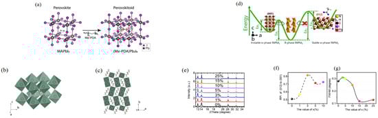 (a) The structures of (Me-PDA)Pb2I6 and MAPbI3; Side view (b) and top view (c) of crystal structure of (Me-PDA)Pb2I6. (Reprinted with permission from Ref. []. Copyright 2021 Elsevier Inc.). The stability of the α-FAPbI3 was affected by adding Ac−. (d) Schematic illustration; (e) The calibrated XRD spectra of the perovskite materials with different amount of AC−; (f) The evolution of RPI of XRD diffraction peak (102) to peak (001); (g) FWHM of (001) with different amount of AC−. Reprinted with permission from Ref. []. Copyright 2021 Wiley-VCH GmbH.
