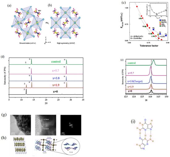 (a) The ground state of o-MAPbI3; (b) High symmetry structures of o-MAPbI3; (c) Corresponding the energy of o-ABI3 (red), o-APbI3 (green), o-MABI3 (blue), and o-MAPbI3 (yellow). The difference of t can be seen according to the horizontal error bars of the o-MABI3 hybrid structures. (Reprinted with permission from Ref. []. Copyright 2016 ACS Publications). XRD patterns of FAPbI3:xMDACl2 perovskite. (d) The perovskite was exposed to 80% humidity for 24 h and annealed at 150 °C for 10 min. (e) The perovskite synthesized with different x values (x = 0, 1.9, 3.8, and 5.7 mol%) and (001) orientation peaks was magnified. Reprinted with permission from Ref. []. Copyright 2019 Science. (f) 14N NMR spectra of α-FAPbI3 (top) and G-containing α-FAPbI3 (bottom). (g) A lower magnification TEM image and high-resolution TEM image of G2FAn−1PbnPbI3n+1 (n = 20) perovskite; (h) The structure of G2FAPb2I7 optimized by DFT. (i) The structure of H bond (HB) dimer, including H bond donating (red) and accepting sites (blue). Reprinted with permission from Ref. []. Copyright by 2019 Angewandte Chemie International Edition.