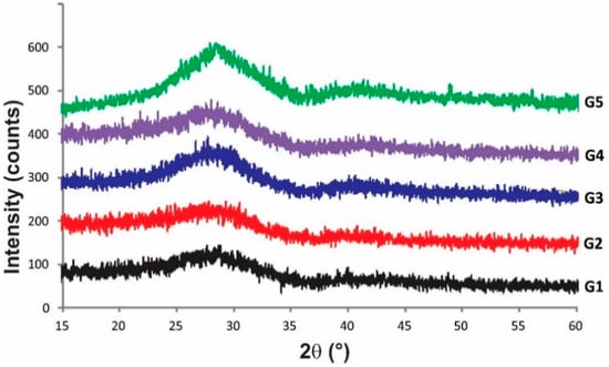 The XRD patterns of synthesized glasses G1–G5 show their amorphous nature.