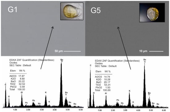 SEM Micrographs and EDS quantification of G1 and G5 glasses. The arrows indicate the point where EDS was performed. The image of each micrograph shows the glass obtained.
