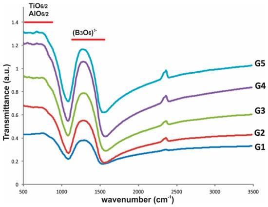 Glass characterization by FTIR, Figure 3, showed the presence of two absorption bands: the first at wave number range 1100–1500 cm−1, which is associated with the B-O bond stretching vibrations and B-O bridging between (B3O6)3− boroxol rings and BO3 triangles [32,33]. The second band appeared at wave number range 500–900 cm−1, attributed to the Ti-O stretching vibrations of the octahedral [TiO6/2] and [AlO6/2] units [4,20,29,34].