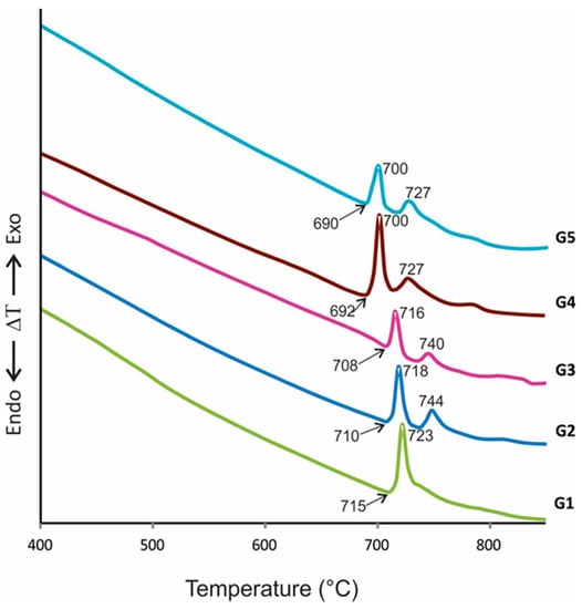 On the other hand, Figure 4 shows the DTA curves of glass samples. The curves observed one or two exothermic peaks at temperatures between 700 and 744 °C, attributed to crystallization events, indicating that all samples can crystallize to obtain glass-ceramics materials with at least one crystalline phase. Likewise, it can be appreciated that an increasing PbO content in starting compositions from 0.5% (G1) to 4.5% (G5) diminished Tg and Tc temperatures, which is essential for economic reasons related to energetic costs.