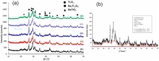 XRD results: (a) X-ray patterns showing crystalline phases present in the glass-ceramics, (b) Glassy and crystalline phases calculated from XRD pattern of the GC5.