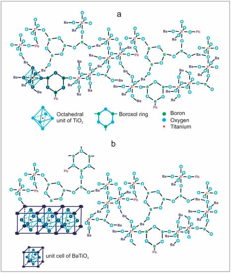 - Ruiz-Valdez, J.J.; Gorokhovsky, A.V.; Escalante-García. Vitrification in the BaO-B2O3-Al2O3-TiO2 system containing small admixtures of PbO. J. Non-Cryst. Solids 2005, 351, 2036–2041. [Google Scholar] [CrossRef]