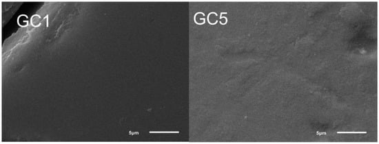 Figure 7 shows the micrographs of samples GC1 and GC5. All glass-ceramics presented a uniform microstructure without pores and cracks. The microstructure is proposed to be formed by crystals with a fine grain size embedded in the abundant residual vitreous phase and homogeneously distributed throughout the material. The above is confirmed by the XRD results showing the presence of crystalline phases with nanometric size in the range of 10.14 to 22.35 nm, as well as a uniform elemental distribution according to the EDS mapping, as seen in Figure 8.