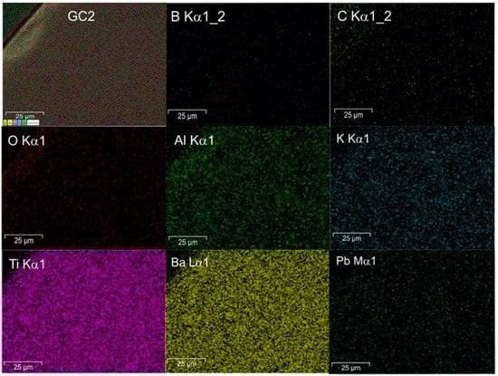 On the other hand, the FTIR gives us information about the short-range ordering of the glasses. In this case, it can be deduced that boroxol rings (B3O6)3− were incorporated into the titanate glassy phase by Ba2+ and Pb2+ ions, giving rise to a single glassy phase (Figure 2), and EDS did not detect the presence of B2O3, but FTIR did. In addition, the principal identified Ba ions could link units [TiO6/2] to form crystalline structures such as Ba4Ti12O27 and BaTiO3, present in glass-ceramics after heat treatment, as a consequence of the rearrangement of these octahedral groups, which are essential in both structures [25,40,41].