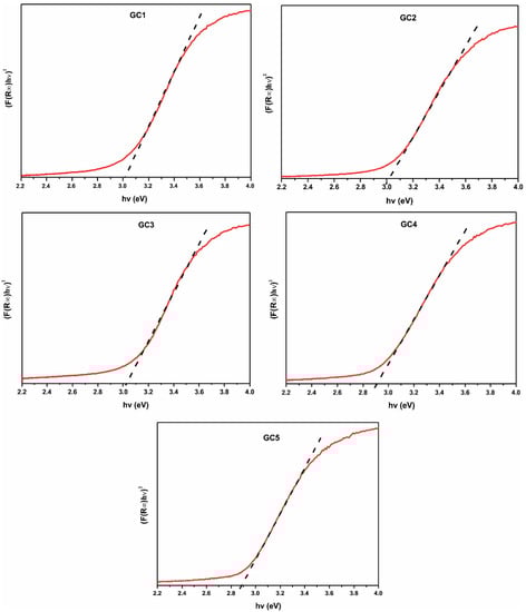 The DRUV-Vis results of samples GC1–GC5 are shown in Figure 9 and listed in Table 2. The values were in the range of 2.88 to 3.05 eV, and it can be seen that lower values correspond to the compositions GC4 and GC5, which have the higher contents of PbO (3.5 and 4.5%, respectively).