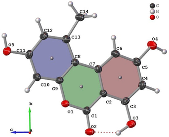 Crystal structure and labeling scheme of alternariol Form II with thermal ellipsoids at 50% probability. Plane 1 (red), Plane 2 (green) and Plane 3 (blue) are also shown.