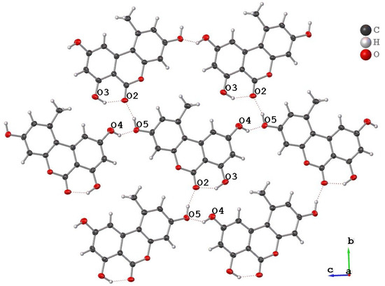The new AOH polymorph (Form II) crystallized in the P21/c space group. The molecule consists of three fused, six-membered rings (Ring 1: C2, C3, C4, C5, C6, C7; Ring 2: O1, C1, C2, C7, C8, C9; and Ring 3: C8, C9, C10, C11, C12, C13); the best-fit planes defined by these rings will be referred to as Plane 1, Plane 2, and Plane 3, respectively (Figure 1). The molecule is nearly planar with a plane twist angle of 2.19(8)° between Plane 1 and Plane 3 and surrounded by six approximately coplanar molecules. A strong intramolecular H-bond (O3-H…O2) is present in the molecular structure. A packing diagram (Figure 2) shows there are four additional intermolecular hydrogen H-bonds (O-H…O) per molecule (Table 2) and one non-classical hydrogen bonding interaction with a distance of 2.986(3) Å (O3-H…O4). Thus, each molecule has classical H-bonding interactions with four of the surrounding alternariol molecules and non-classical hydrogen bonding interactions with the remaining two molecules (Figure 2). All H-bonding interactions are between approximately coplanar molecules. There are two pairs of closely π-stacked layers with interlayer distances of 3.391 Å and 3.322 Å between each pair, while alternating pairs form a dihedral angle of 7.10° (Figure 3).
