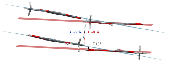 Perspective view depicting the interlayer distance and dihedral angle between best fit planes for two pairs of π-stacked molecules.