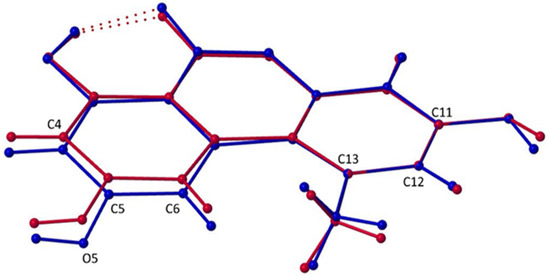 Overlayed wireframe images of alternariol Form I (blue) and Form II (red) matching C11, C12, and C13 of each structure.