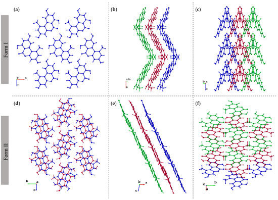 From the dnorm surface, 2D fingerprint plots are assembled in Figure 8. Here, dark blue squares represent the fewest concentration of points, green—moderate, and red—dense concentration of points. The shapes of the full fingerprint plots for Forms I and II share some similarities. They each have two sharp spikes in the bottom left quadrant of the plot that correspond to the shortest interactions (O…H); however, the spikes of Form II are much sharper. Both plots also show a cluster of green and red squares roughly around di = de ≈ 1.8–2.0 which indicates C…C interactions and π-π stacking interactions; however, Form II has a larger concentration of these interactions.
