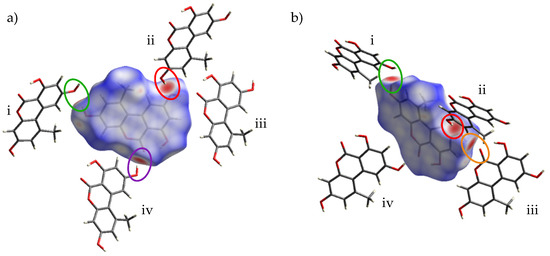 Intermolecular interactions were investigated for Form I and Form II of alternariol via analysis of Hirshfeld surfaces. Figure 6 shows the Hirshfeld surface for Form I, mapped over dnorm (from −0.6764 to 1.0428) along with the neighboring molecules associated with the closest contacts. Figure 7 shows the Hirshfeld surface for Form II, mapped over dnorm (from −0.7193 to 1.2040) along with the neighboring molecules associated with the closest contacts. Figure 6a and Figure 7a illustrate the contact points. In both figures, the red regions on the surface represent the closest interactions between molecules. Four intermolecular H-bonded interactions, O5-H…O4i (2.809(3) Å; green), the reciprocal O4…H-O5ii (2.809(3) Å; red), O4-H…O2iii (2.685(3) Å; orange), and O2…H-O4iv (2.685(3) Å; purple) dominate Form I (Figure 6). Similarly, four intermolecular H-bonded contacts are encountered in Form II: O5-H…O2i (2.640(2) Å; green); O5…H-O4iv (2.735(2) Å; purple); O4-H…O5ii (2.735(2) Å; red); and O2… H-O5iii (2.640(2) Å; orange) (Figure 7). In both Forms I and II, there is a pattern of two shorter, 2.685 Å (I) and 2.640 Å (II), and two longer, 2.809 Å (I) and 2.735 Å (II), intermolecular H-bonds, the ones of Form II being approximately 0.050 Å shorter than the corresponding ones in Form I. Counterintuitively, the tighter H-bonded pattern of Form II does not render it denser than I, with calculated densities of 1.594 g cm−3 vs. 1.590 g cm−3 for I and II, respectively. In Form I, three smaller, less intense red spots can be observed, denoting long-range interactions: the first one between the methyl group (C14) of external molecule i and O5 of the central molecule with a distance of 3.768(3) Å. The second long range interaction can be seen between the methyl group of the central molecule and the methyl group of an external one directly above it (not shown in Figure 5) with a distance of 3.7244 (6) Å. The third long range interaction at 3.547(3) Å can be seen between C4 of external molecule iv and O1 of the central one. This last interaction can also be seen between C4…O1iii. A number of long-range interactions can also be seen in Form II. The first is a non-classical hydrogen bond between O4 of the central molecule with O3-H of an external one (shown in Figure 2) with a distance of 2.986(3) Å. The second interaction is between O1 of external molecule i and C12 of the central one with a distance of 3.821(3) Å. Two additional reciprocal interactions between C4 and the methyl group are shown at 4.126(3) Å.