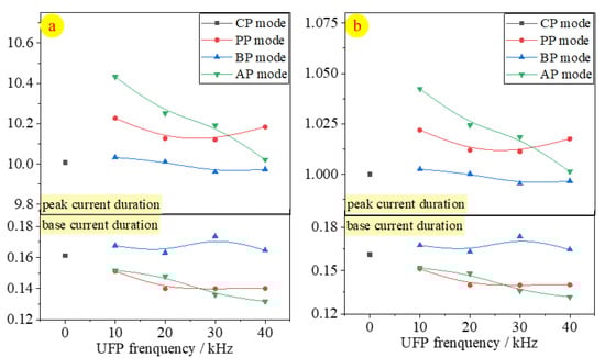 Compared with CP mode, the Farc (Figure 2a) and Fp quantized value (Figure 2b) under different UFP modes (PP/BP/AP), frequencies (10–40 kHz), and current duration (peak/base) are exhibited. It could clearly be seen that the curve of Farc and Fp possessed the same trend—there were just slight differences in the amplitude of curve fluctuation. There’s UFP in the peak-current duration of PP and AP modes, the arc shape was axially compressed, Fp increased by 1.57% (PP) and 2.17% (AP), respectively, on average, compared with CP mode. However, there’s no UFP in the peak-current duration of BP mode; therefore, the Farc and Fp in BP were in line with CP mode. As for base-time duration, there was a slight rise in BP and a decrease in PP/BP. In short, the consequence indicated that the UFP was capable of increasing the Farc and Fp.
