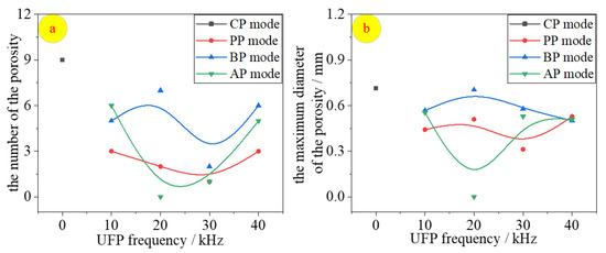 As a result, the porosity quantities, maximum diameter of UFP modes decreased obviously as shown in Figure 4, which displays the porosity quantities (Figure 4a) and the maximum diameter (Figure 4b) in different modes and frequencies. Compared with CP mode, the porosity quantities decreased by 75% for PP, 45% for BP, 67% for AP on average, respectively. It was noteworthy that there’s no porosity at AP-20 kHz. The porosity maximum diameter decreased by 37% for PP, 18% for BP, 26% for AP, respectively.