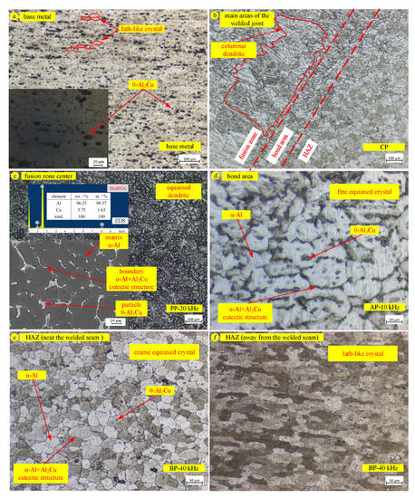Figure 5 reveals each microstructure area of the welded joint under different UFP modes and frequencies by OM/SEM. Base metal, the rolled 2219 aluminium alloy consisted of lath-like crystals, which possessed the matrix phase α-Al and second phase particles θ-Al2Cu, as shown in Figure 5a. The molten pool began to solidify at the end of the welding process; it was easy for the grains to nucleate at the wall of the molten pool, squeezing with each other and growing to form columnar crystals, as shown in Figure 5b. Nevertheless, the grains in the fusion zone centre grew without directionality, full of classical aluminium equiaxed dendrites, as shown in Figure 5c. The bond area was a partially melted zone, where the temperature distribution was extremely uneven, causing the size of fine equiaxed crystals to also be nonuniform, as shown in Figure 5d. HAZ was the unmelted zone; however, the difference in peak temperature value and duration generated various grain morphology and microstructure as shown in Figure 5e,f. HAZ near the fusion zone went through the recovery and recrystallization, leading to coarse equiaxed crystals. Nevertheless, HAZ away from the fusion zone possessed little change of deformation, which consisted of lath-like crystals.