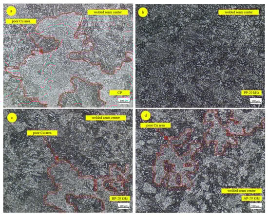 Because of the electromagnetic stirring effect on molten pool, UFP was capable of increasing the molten pool fluidity, improving uniformity of temperature distribution [19,20]. Thus the regional element segregations of Cu were suppressed, as shown in Figure 6, which shows the microstructure of fusion zone centre under different UFP modes. The poor Cu area was relatively white. There was a big area size and ratio of poor Cu area within the field of vision in CP mode, as shown in Figure 6a. By comparison, the inhibition effect of regional element segregations for PP, BP and AP appeared improved significantly, which predicated the fusion zone of UFP possessed a more homogeneous microstructure distribution than CP.