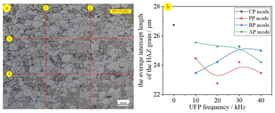 By calculation, the values of Lavg under different UFP modes/frequencies were shown in Figure 7b. A previous study [21] found that UFP was able to not only raise the molten pool temperature, but also improve the HAZ temperature at the same distance away from welding pool centre. Meanwhile, the higher peak temperature led to grain refinement [22] of HAZ near the fusion zone. As a result, the UFP Lavg value was obviously smaller than CP, the grain refinement degree increased by 11.27% for PP, 8.43% for BP, and 6.23% for AP on average, respectively.