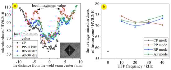 In conclusion, UFP had the ability to decelerate regional element segregations, improving the homogeny of microstructure distribution. Thus, the microhardness property of the welds became better, as shown in Figure 8, which exhibits the microhardness value under different UFP modes and frequencies.