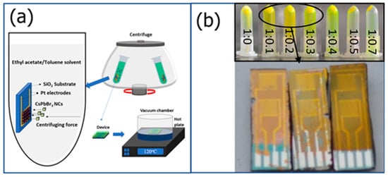 - Chen, L.-C.; Tien, C.-H.; Tseng, P.-W.; Tseng, Z.-L.; Huang, W.-L.; Xu, Y.-X.; Kuo, H.-C. Effect of Washing Solvents on the Properties of Air-Synthesized Perovskite CsPbBr3 Quantum Dots for Quantum Dot-Based Light-Emitting Devices. IEEE Access 2020, 8, 159415–159423. [Google Scholar] [CrossRef]