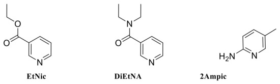Structures of the studied ligands EtNic [64,65,66], DiEtNA [67,68,69,70] and 2Ampic [71,72,73].