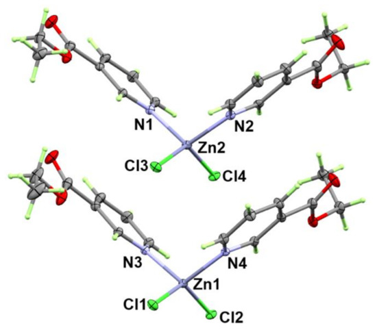 The X-ray structure of the heteroleptic Zn(II) complex 1 is shown in Figure 2. The complex crystallized in the monoclinic crystal system and P21/c space group. The unit cell parameters were a = 14.1940(9) Å, b = 19.8380(11) Å, c = 14.3957(9), Å and β = 111.432(3)°. The view of the unit cell of 1 along the ac plane is shown in Figure S1 (Supporting Materials). The asymmetric unit comprised two [Zn(EtNic)2Cl2] formula units. The Zn(II) was coordinated with two EtNic molecules via the ring N-atom and two chloride ions. The Zn–N distances were marginally different (2.057(3)–2.061(3) Å), and the same is true for the Zn–Cl bonds (2.221(1)–2.226(1) Å). The N-Zn-N and Cl-Zn-Cl angles were in the ranges of 110.68(13)–110.84(13)° and 129.13(4)–129.46(4)°, respectively (Table 1). Hence, Zn(II) was tetra-coordinated with a distorted tetrahedral coordination environment, which is expected for a small size metal ion with a spherical d10 configuration.