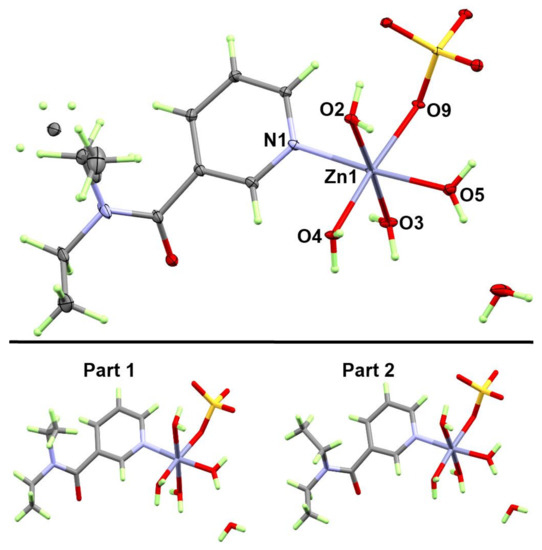 - Bigoli, F.; Braibant, A.; Pellinghelli, M.A.; Tiripicchio, A. The Crystal and Molecular Structure of Diaquobis-(N,N-diethylnicotinamide)-diisothiocyanatozinc. Acta Cryst. B 1973, 29, 2344. [Google Scholar] [CrossRef]
