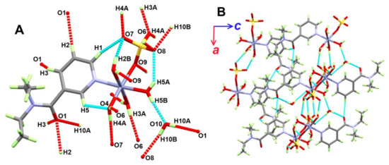In contrast to 1, the supramolecular structure of 2 was controlled by several strong O-H···O hydrogen bonds (Table 3). The coordinated and crystal water molecules acted as hydrogen bond donors, while the oxygen atoms from the amide group, the coordinated sulfate ion, and the crystal water were the hydrogen bond acceptors. In addition, the structure was found to be stabilized by some intramolecular O···H interactions. The intra- and intermolecular hydrogen bonds are shown in Figure 5A as turquoise and red dotted lines, respectively, while the 3D packing structure is shown in Figure 5B.