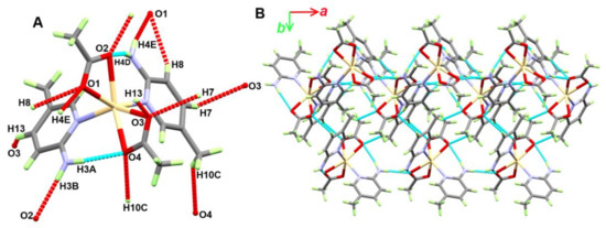 The intra- and intermolecular contacts (A) and packing scheme via O-H···O hydrogen bonds along ab plane (B) of 3.