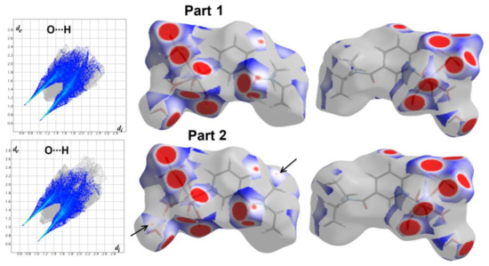 The fingerprint plots and dnorm maps related to O···H contacts in 2. The solid black arrows refer to the extra O10…H31C interactions that exist in part 2.