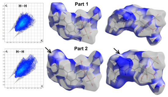There was another difference between the two disordered parts of complex 2. In part 2, there was one short H···H contact (H14B···H31C) which was not found in part 1. The interaction distance of this contact was 2.167 Å. The steep spikes that occurred in the fingerprint plot of part 2 and the red spot in the corresponding dnorm map were additional evidence of the importance of the H···H contacts in part 2 of complex 2 (Figure 10).