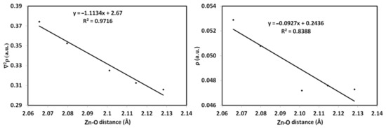 According to the AIM approach [87,88,89,90], each bond has a bond path and a bond critical point [91]. We calculated the AIM parameters of each coordinate bond at its BCP (Table S3 (Supplementary data)). According to the literature, the degree of the electron density function (ρ) at BCP can express the strength of the bond [91]. It is clear that all bonds hadan electron density (ρ) smaller than 0.1 a.u., and the Laplacian (∇2ρ) had positive values; this clearly revealed the predominant closed-shell character of the Zn-Cl, Zn-N, Zn-O, Cd-O, and Cd-N bonds, which agrees with their spherical coordination environment, indicating that no specific coordination is preferred and only size determines the number of ligands [92,93,94]. In addition, large ρ and ∇2ρ values indicate that the structure has a high level of local stability [95,96]. As clearly seen in Table S3 (Supplementary data), these parameters were higher for the Zn-N interactions in complex 1 than those in 2, which agrees with the shorter Zn-N bonds in the former compared with the latter [97]. Similarly, there are clear inverse correlations between these parameters and Zn-O distances (Figure 13). On the other hand, the quantities of total energy density (H(r)) [98] were near zero, indicating very well that all coordinate bonds have low covalent characters.
